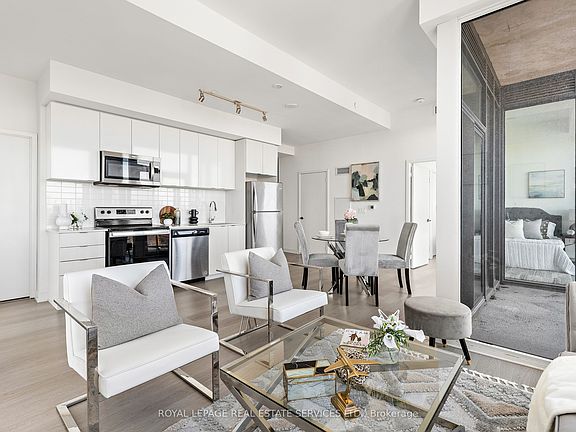Step into 1,080 sq. ft. of stylish, functional living in this beautifully appointed 3-bedroom + den, 2-bathroom corner condo in Toronto's vibrant West End. Designed for comfort and flexibility, this bright northeast-facing unit is flooded with natural light from floor-to-ceiling windows and features soaring 9-foot ceilings and a smart, open-concept layout. Warm vinyl flooring flows throughout the living space, connecting to a sleek, contemporary kitchen with stainless steel appliances and porcelain tile finishes-perfect for everyday meals or weekend entertaining. The generous living and dining areas offer room to relax or host, while the versatile den can be used as a home office, creative space, or even a cozy reading nook. The private primary suite offers a quiet retreat with a well-appointed ensuite, while two additional bedrooms provide ample space for family, guests, or roommates. Residents enjoy premium building amenities, including a modern kitchen lounge, private dining room, children's play area, full gym, outdoor cabanas, BBQ stations, and a social lounge. Located along The Queensway, you're just minutes from Sherway Gardens, Costco, Sobeys, Cineplex Odeon, and an incredible mix of dining and retail options. With the QEW, Hwy 427, and TTC nearby, this home blends lifestyle and convenience with ease.