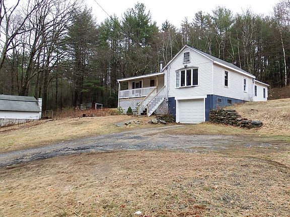 This 1950âs Bungalow with an attached garage is nestled on a large 3 acre lot in a tranquil nature lovers location. Up and through the front porch enter in to find a quaint Kitchen offering additional warmth with a gated wood stove that flows into the charming Living Room accented with a wooden beamed ceiling. Off the Kitchen find the Dining Room boasting a beautiful diagonal wood plank accent wall and large picture window allowing for ample sunlight. Completing the interior are 3 Bedrooms and Full Bath with a dual sink vanity and Laundry along with an unfinished basement awaiting your creative spirit. The house retains the value of peaceful living with rustic charm while being conveniently close to main commuter route 119, tax free NH and Trap Falls and Pearl Hill State Park, perfect for a nature filled adventure.