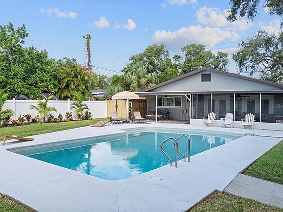Welcome to this enchanting 3 bedroom, 2 bath home with a HEATED DEEP POOL on a spacious DOUBLE LOT, Located in UNINCORPORATED Pinellas County, offering attractive SHORT TERM RENTAL POTENTIAL, ideally situated just off the famed PINELLAS TRAIL for easy biking, jogging, and weekend adventures. With 1,916 sq ft of beautifully appointed living space, the home features an airy open concept layout anchored by a charming wood burning fireplace and abundant natural light. Recent updates include a 2025 ROOF ON HOME AND PERGULA new garage door opener, fresh exterior paint this year, a 2023 POOL HEATER and a 2024 POOL PUMP 2025 POOL FILTER. The pool was also RESURFACED IN 2025. The fenced backyard is a serene oasis with a sparkling pool, sun splashed patio, and a pergola perfect for al fresco dining and evening cocktails. There is excellent storage for gear and garden tools plus a 2 car garage to keep vehicles secure and cool. The spa inspired primary bathroom is a showstopper, highlighted by a freestanding soaking tub, a frameless glass shower with herringbone tile, niche shelving, and pebble style flooring, along with warm brass fixtures, dual arched mirrors, stylish sconces, and a sleek double vanity with generous storage. Two additional bedrooms giving flexible space for guests, an office, or hobbies, and the home provides plenty of closets throughout. Moments from local restaurants, boutiques, and everyday conveniences, and a short drive to award winning beaches, this property blends comfort, lifestyle, and location. Buyer to verify local rules. Come live, play, and unwind in one perfect place.