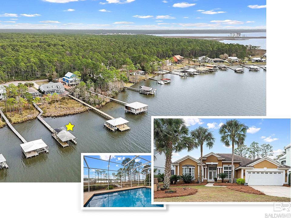 Spacious single-story waterfront home on Wolf Bay, located in the Bay Harbor subdivision in Elberta. This 3-bedroom, 2.5-bath residence offers a thoughtfully designed layout ideal for both everyday living and entertaining. Additional office space. The main living areas feature high ceilings, abundant natural light, and a fireplace that anchors the living room, creating a warm and inviting atmosphere.Updated kitchen with a large center island, flowing seamlessly into the dining area, breakfast nook, and family room. The primary suite offers generous space with a private bath featuring dual vanities, a soaking tub, and a separate shower. Three additional bedrooms each have access to full bathrooms, providing comfort and privacy for family and guests.Outdoor living is a standout feature, with a screened porch and swimming pool overlooking Wolf Bay, ideal for relaxing or entertaining. The property includes a private pier and covered boat dock, offering direct water access. Additional features include a dedicated laundry room, ample storage, and an attached garage.Buyer to verify all information, measurements, square footage, waterfront details, and features during due diligence. Buyer to verify all information during due diligence.