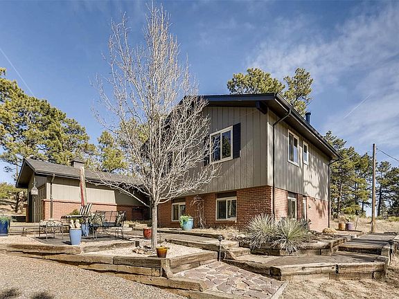 Location, location! Darling home surrounded by huge Ponderosa trees and paved roads. Two entrances greet you to the circular driveway that offers additional parking and easy access. Wide Plank hardwoods flow through the main living area, kitchen, dining, hallway, and stairs. The main floor offers beautiful shiplap ceilings. A brick wood-burning fireplace and a wall of windows, bring the outside in. A truly authentic mid-century modern kitchen makes this a very well maintained home. The laundry room has an extra space for a small office area and craft/sewing room. Two paver patios for entertaining, one in front and one out back. Special features; Renewal by Anderson windows/sliding door, second brick wood burning fireplace, almost all year round sunroom. Detached garage is perfect for any extra storage needed or tractors/hobbies. Enjoy views from every window along with the wildlife. Country living at its best yet 6 minutes to downtown Parker with all amenities, and minutes to E-470.