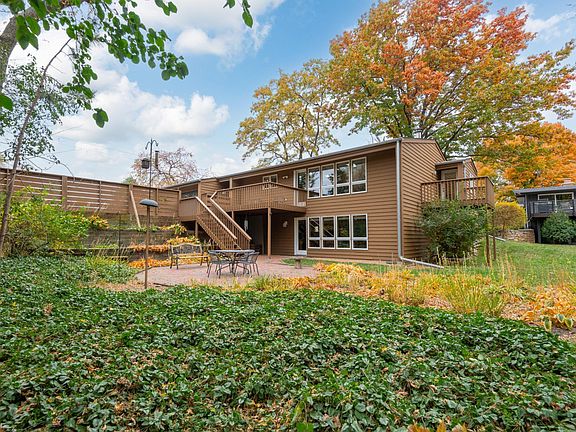 Welcome to this custom built mid-century modern style rambler. A bright yellow door cheerfully leads into a long foyer punctuated by a pair of custom triangle accent windows. The open concept main level offers half vault ceilings with natural light beaming in from multiple skylights, maple floors and a wood burning Encore stove in the living room. A wall of windows in the living room overlooks the Hosta garden and lower level patio. Step onto the deck from the dining room and enjoy views of birds splashing in the birdbath in your spacious backyard. The primary bedroom features a walk-in closet and ensuite bath as well as a private balcony. The main level is completed by a second bedroom and a convenient laundry room. Gorgeous natural wood stairs lead to the lower level with a complete in-law apartment! This area includes a second kitchen with stainless steel appliances, another primary bedroom with a large walk-in closet and ensuite bathroom, family room and den, along with a washer and dryer. The family room also boasts a wall of windows and walks out to the lower patio and backyard. Use this area as your own or even a rental! Walking outside from the lower level, the yard is flat and has plenty of room for games and relaxation. Enjoy a fire on summer nights in one of the two firepits. Two sheds offer extra storage space. Mature trees border the back of the lot, providing a scenic backdrop. Easy access to Highway 5 and just across the street from a 14 acre park with walking trails, a playground and more. On the market for the first time ever!