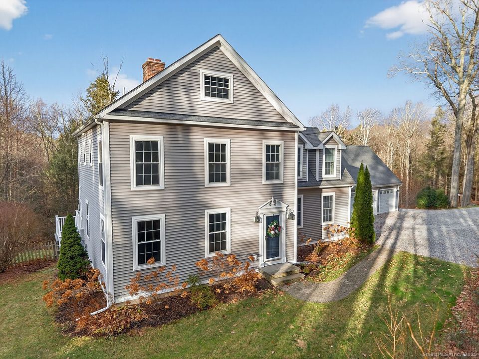 Welcome to your private retreat on over 10 wooded acres in Barkhamsted. This custom colonial offers 3 bedrooms, 2.5 baths, and a unique, inviting floor plan. The first floor features wide-board flooring, 9-foot ceilings, oversized windows, and an open layout. The kitchen sits at the heart of the home with newer appliances, a butcher block island, and a beautiful brick fireplace with raised hearth. It opens to the large dining room and step-down family room-ideal for everyday living or entertaining. A first-floor laundry room and powder room add convenience. The second floor includes a spacious primary suite with a white-washed brick fireplace and antique mantle, a large walk-in closet and dressing area, and a remodeled bath with a stone-floor walk-in shower, quartz vanity, double sinks, and striking black tile. A small office and two additional bedrooms with an updated full bath complete the level. A walk-up attic and walk-out basement offer great storage or expansion potential. The basement includes a wood-burning furnace for an alternative heat source and access to an attached storage shed. A generator with transfer switch provides peace of mind. The covered breezeway leads to an oversized three-car garage or to the large, rear trex deck overlooking the yard and woods. Nature lovers will appreciate the 10.13 acres of pristine woodland, complete with private trails, a brook and two ponds-a serene and picturesque setting for exploring, relaxing, and enjoying wildlife.