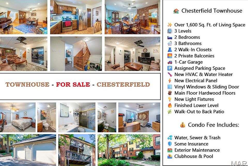 Offering over 1600 sq. ft. of Living Space, this well-maintained home features 2 Bedrooms, 3 Bathrooms, 1 Car Garage and multiple outdoor spaces including two private balconies and a walk-out patio surrounded by a peaceful neighborhood setting. THE UPPER LEVEL offers two spacious bedrooms – each with its own 7x6 walk-in closet – and a shared full bath. THE MAIN LEVEL features a bright living & dining combo, half bath, and a functional kitchen with parquet flooring, SS appliances, and ample breakfast area. The main level hardwood floors add warmth and character throughout. THE LOWER LEVEL includes a recreation room with wet bar, a full bathroom, and a 10x10 laundry/utility & storage area, with walk-out access to the back patio – perfect for entertaining or relaxing outdoors. RECENT UPDATES INCLUDE: vinyl windows & sliding doors, some updated panel doors, new main electrical panel (2023), and new HVAC system & water heater (2024). While the HOME IS IN GOOD SHAPE OVERALL, there’s room to add value with personal touches – new carpet, fresh paint, refinished hardwoods, or modernized bathrooms & kitchen cabinets could make this property shine. THE SELLER PREFERS AN AS-IS SALE IN ITS PRESENT CONDITION WITHOUT BEING RESPONSIBLE FOR ANY REPAIRS OR INSPECTIONS, AND AN OPTION TO LEAVE SOME PERSONAL BELONGINGS IN THE UNIT AFTER CLOSING – ALL ABOVE REFLECTED IN THE ATTRACTIVE ASKING PRICE. This is a fantastic opportunity for investors (rentals permitted per owner’s knowledge) or buyers looking to earn instant sweat equity in a desirable Chesterfield location close to shopping, dining, and top-rated schools. A GREAT TOWNHOUSE IN A GREAT LOCATION – PRICED TO SELL! DON’T MISS IT!