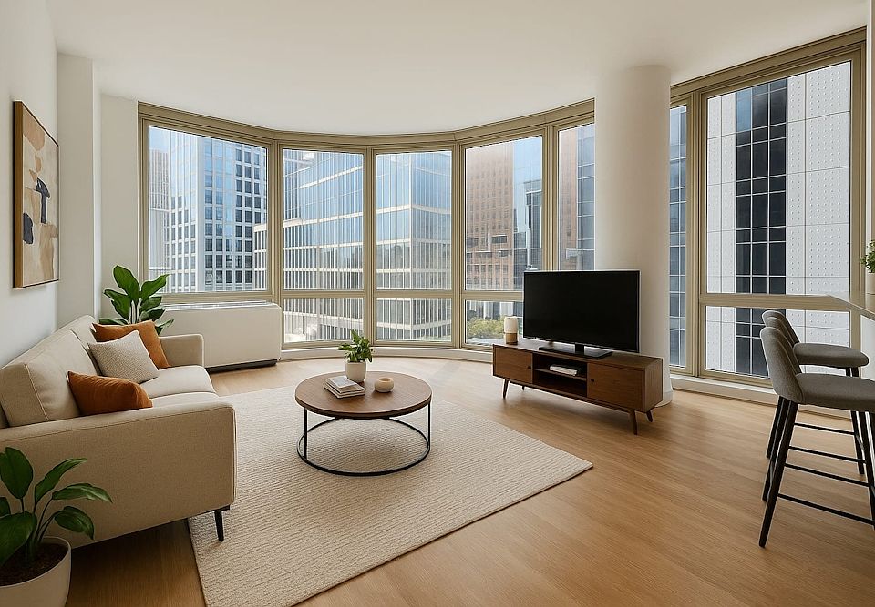 This stunning one-bedroom residence redefines modern living. This home features a king-sized bedroom and an extraordinary curved glass living room, elegantly designed to capture natural light and breathtaking views through its floor-to-ceiling windows. With southern and western exposures, the space is bathed in warm sunlight, highlighting the sophisticated finishes throughout.