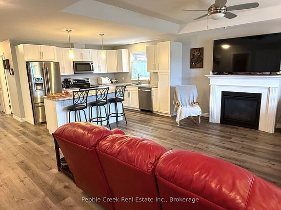 Welcome to an amazing lifestyle! Imagine living along the shores of Lake Huron, close to Goderich with its historic town square and abundance of shopping, fantastic golf courses and your own private community recreation center with indoor pool, library and entertainment facilities. This very popular Cliffside B with Sunroom model features nearly 1600 sq ft of living space and a long list of upgrades! Once you step inside this beautiful home, you will be impressed with the spacious open concept, living room with gas fireplace and tray ceiling! The adjacent kitchen offers an abundance of cabinets with oversized center island, pots and pan drawers, pantry, corner turntable and upgraded appliances. The dining room also sports a tray ceiling and the cozy sunroom has a vaulted ceiling and patio doors leading to the extended size composite deck with privacy screen at the end. There's also a large primary bedroom with walk-in closet and 3 pc ensuite bath and a spacious guest room with 4pc bath right beside. Additional features include kitchen pantry and extended height cabinets as well as upgraded light fixtures. Also located throughout the home are custom blinds which are sure to impress! The home offers plenty of storage options as well with an attached 2 car garage, lots of closets and a full crawl space underneath! Situated in The Bluffs at Huron land lease community, just a few streets back from the lake and rec center, this home is a must see for anyone considering moving to this upscale adult subdivision! Bonus 6 appliances included!