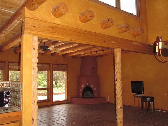 Passive solar with South Bank of Windows, Vigas, 2 Kivas and Tile floors, Open Concept, with separation of bedrooms, Deck with outstanding views to the Sangre de Cristo Mountain Range. Clerestory windows add lots of light and bright. Natural gas to Kiva stove and hot water heater.