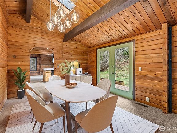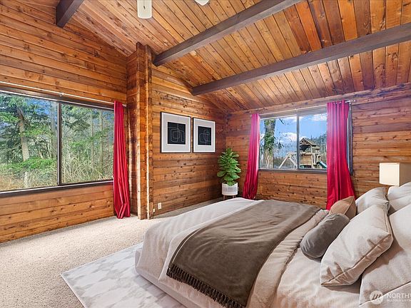Tucked into nearly five acres of forest-wrapped privacy, this original one-level log cabin offers the rare kind of quiet that’s hard to find. Built in 1976 and rich with authentic character, the home sits adjacent to hundreds of acres of protected state land—ensuring lasting privacy, preserved trails, and a natural backdrop that won’t be developed. Inside, vaulted ceilings with exposed beams and a dramatic stone fireplace anchor the main living space. An efficient wood-burning insert adds both warmth and character, while the open living and dining area feels expansive yet grounded—designed for everyday living as well as gathering. This home offers four bedrooms and two full bathrooms, including a primary suite with an ensuite bath, all thoughtfully arranged on a single level. Outside, the acreage provides room for horses, chickens, gardens, or simply space to breathe. Located on an easy-access island with no ferry required, the property is conveniently close to everyday amenities while remaining deeply connected to nature. Two nearby state parks—including one with a boat ramp—are just minutes away, offering beaches, trails, and endless opportunities to explore the outdoors. Whether envisioned as a peaceful full-time residence tucked into nature or an unplugged retreat with room to reimagine, this is a rare opportunity to own a true log cabin sanctuary—private, authentic, and quietly special.