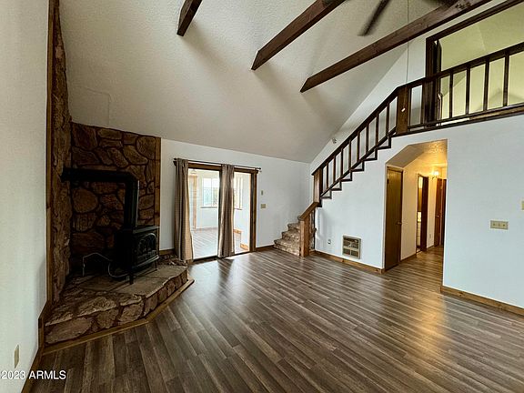 We invite you to explore this tall home situated on one acre. Fully fenced with a red steel workshop. Walk in and enjoy the high ceilings bringing in the natural light, spacious laundry room, and open AZ Room. Views can be enjoyed from almost every part of this home. The master suite is upstairs with a full bath. The 2 bedrooms downstairs share a 3/4 bath. The living room offers a propane fireplace. This home is well insulated with T1-11 and a stucco exterior and new roof! We are excited for you to see this property for yourself.