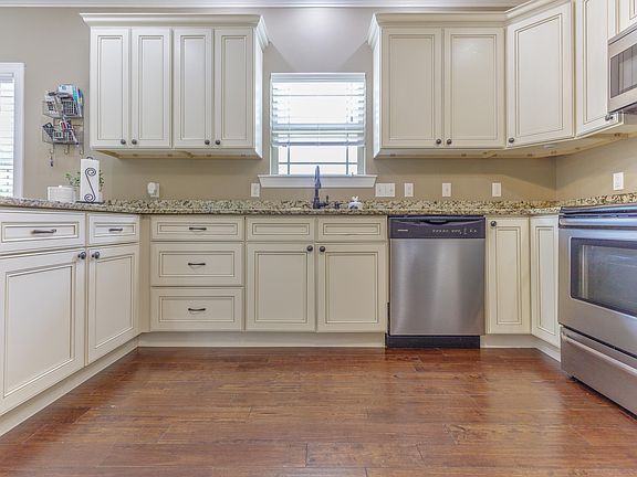 Fenced level backyardCovered front porchTwo-tiered back deckGranite countertopsSplit bedroom layoutIntricate crown moldingElegant ivory cabinetry