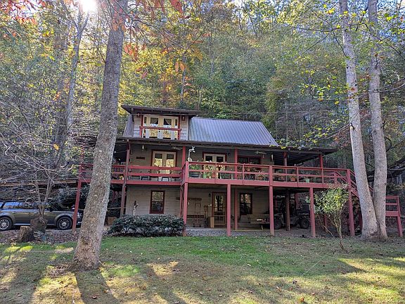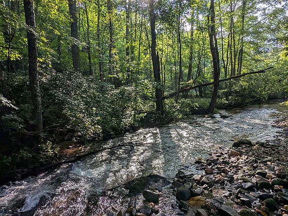 If you are looking for water--this is it! Bold Big Creek wraps around this property with over 800 feet of creek frontage on a 4.8 acre tract. This cabin possesses grounds people dream of with a fishing pond, pasture, mature trees, designated trout stream, boisterous water, authentic log cabin and a huge barn. Three bedrooms, three full baths, one on each level. The restful great room has a ventless fireplace with gas logs. Paved roads until you turn onto Tipton Court. Walking distance to US Forest Service land.