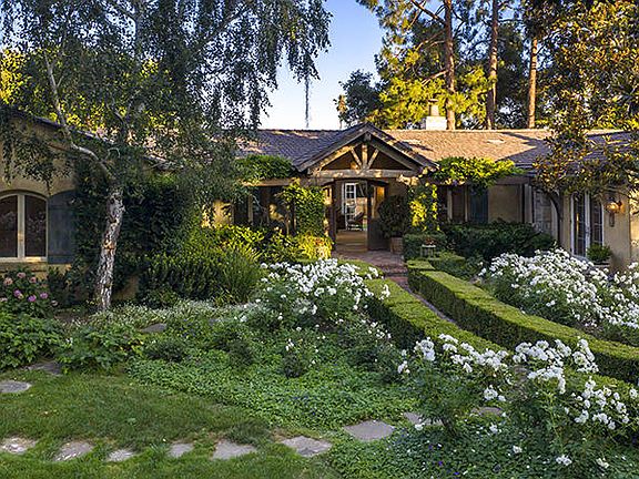 Private gates open to a romantic French Country-style residence on 1.31± ac with mountain views, vibrant bloom-filled gardens, delightful outdoor entertaining areas, tiered rose gardens, a waterfall spa & a fabulous outdoor gazebo w/ kitchen & BBQ perfect for alfresco dining. Expansive light-filled rooms connect the interiors to the outdoors in this 4,808± sf single-level offering 3 beds/3.5 baths + office or 4th bdrm. The home exudes a provincial warmth w/ curved arches, stone floors & wood beams. There's an ample living room, dining room, inviting kitchen opens to the rustic family room w/ stone fireplace & wet bar. The master suite opens to a flagstone terrace w/ fireplace for a relaxing evening under the stars. Two roomy guest beds enjoy exquisite garden views & shared bath.