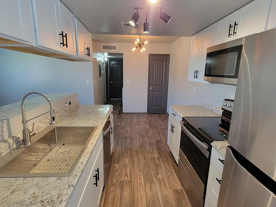 Typhoon ice counter topsCommunity poolKraus deep kitchen sinkWood vinyl flooringAll-white shaker style cabinetsNew stainless steel appliancesFaux wood blinds