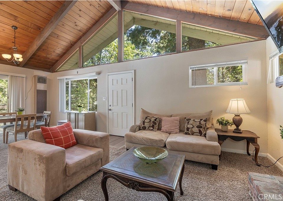 Less than 2 hours away from the hustle of LA, this Lake Arrowhead cabin is the perfect cozy retreat! Located in the prestigious Arrowhead Villas, this 2 bedroom, 1.5 bathroom cabin is full of rustic charm. Breathe in the fresh mountain air, while you relax on one of the two deck spaces surrounded by mature trees. Beautiful vaulted ceilings and lots of natural light throughout, as well as newly installed windows (2023). The spacious eat-in kitchen features ample counter space, while the large dining area provides more seating for larger gatherings. The main bedroom with en-suite powder room as well as a full bathroom are located on the entry level, and the second bedroom is located downstairs. Enjoy the added convenience of a full laundry and storage room, which can also be used as a home office. Take advantage of the recently installed roof (2023), adding value and durability to the home. The possibilities for this cabin are endless, whether you are looking for a primary residence, 2nd home for weekend getaways, or rental income. Easy access to Rim of the World HWY and other mountain communities, shopping, and restaurants.