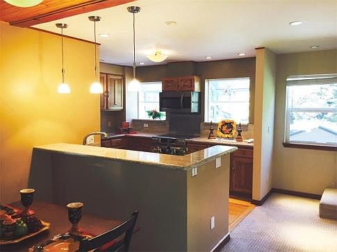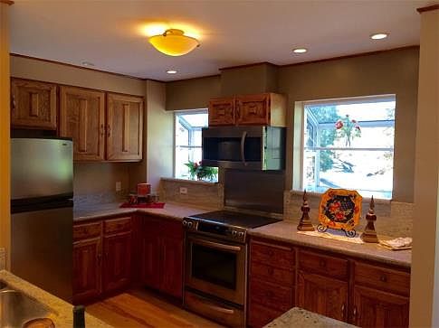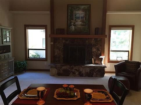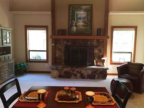 Located near the Mountain Golf Course. Low elevation end unit, open kitchen and living room. Kitchen has stainless steel appliances and hardwood floors. Living room with vaulted ceilings and fireplace. Fenced yard with natural landscaping. One bedroom is a loft with closet. Garage was converted to 3rd bedroom.