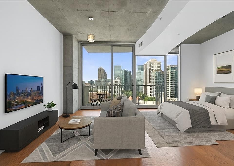 Discover modern city living in this spacious studio apartment at the highly sought-after Spire Midtown Condominiums. This rental offers breathtaking north-facing skyline views of Midtown. The well-appointed kitchen features granite countertops, tile backsplash, abundant cabinetry, and a moveable island, making it easy to cook and entertain. Despite being a studio, the smart layout provides ample space for a king-size bed, dining area, and full living room setup. A full-size washer and dryer are conveniently located near the bathroom. There is a large covered balcony off the living room. This studio has floor to ceiling windows, tall ceilings, hardwood floors, and a modern urban flare with cement ceilings. Residents of Spire enjoy luxury amenities including a 24-hour concierge, multiple fitness centers, a resort-style saltwater pool, outdoor grilling stations, and a stylish club room. This unit comes with the a deeded covered parking spaces in a secure garage. The location is unbeatable steps from MARTA transit, dedicated bike lanes, and countless Midtown restaurants, shops, and cafes. Piedmont Park is just minutes away, and you can reach the airport or downtown without needing a car. Perfect for anyone seeking affordable luxury, unbeatable convenience, and a vibrant lifestyle in the heart of Atlanta.