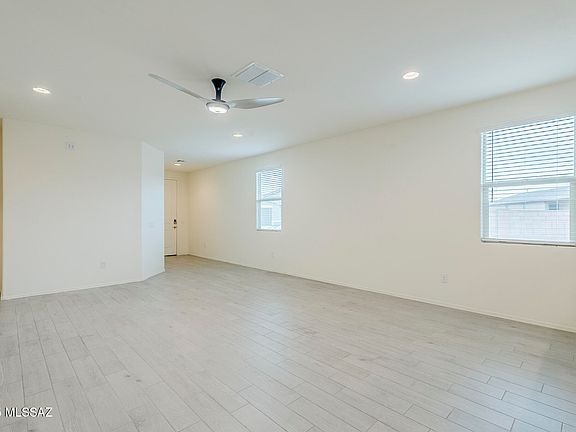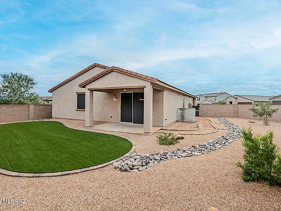 Built in 2022, this beautifully maintained 3-bedroom, 2-bathroom home offers 1,967 sqft of stylish living space on an oversized, fully landscaped lot. Located in the award winning community of Rancho Sahuarita, this newly constructed, energy-efficient property is packed with upgrades and ready for its next owner. A rare 3-car garage with epoxy floors and dedicated storage area, plus an extended driveway, provides ample parking and allows for complete organization. The private backyard is thoughtfully designed with low-maintenance artificial turf, decorative gravel, desert plantings, and a spacious side yard perfect for entertaining or future outdoor enhancements. Inside, enjoy wood-look tile flooring throughout the main living areas and a enormous great room that opens to a modern kitchen featuring dark cabinetry, gleaming granite countertops, updated fixtures, and a cozy dining area with sliding glass door access to the backyard.