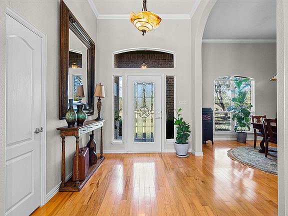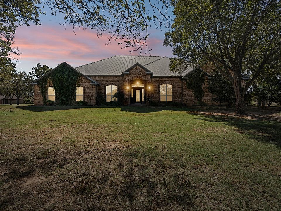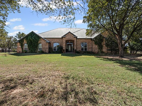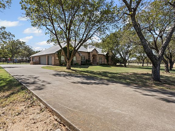 Beautiful curb appeal and resort-style living await in this spacious, single-story brick home! Located in The Retreat within the desirable Pecan Plantation community, it's perfectly situated on a 1.697-acre corner lot and surrounded by mature trees. Inside, you’ll find 4 bedrooms and 2 baths with an open-concept living and kitchen area featuring warm wood floors, large windows with scenic views, and a cozy fireplace. Large kitchen with stunning granite countertops, an abundance of white cabinetry, center island with dual sinks and breakfast bar seating flows seamlessly into the breakfast nook and has a formal dining area just around the corner, creating an inviting space for everyday living and entertaining. The spacious primary suite includes a comfortable seating area and a stunning ensuite with dual granite vanities and a large walk-in shower, and a generous closet. Step outside to your backyard oasis—fully fenced and beautifully landscaped with a sprinkler system using Orchard water, a large covered porch, and a sparkling chlorine pool perfect for relaxing or hosting family and friends. The property also boasts a 4-car garage with a 220 plug; the end garage serves as an excellent workshop, complete with a 50-amp outlet, sink, and generous storage. Additional features include a dog room off the back porch and impeccable outdoor spaces designed for relaxation. Located in the gated, resort-style community of Pecan Plantation, residents enjoy 24-hour security, golf courses, a marina, tennis courts, swimming pools, restaurants, a grocery store, and more—all just a short drive from the Metroplex. Come experience this exceptional home and the incredible lifestyle that comes with it—life happens here!