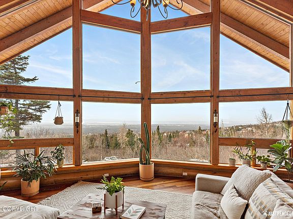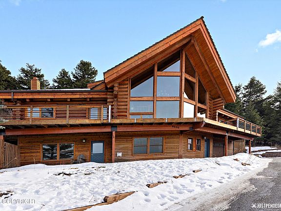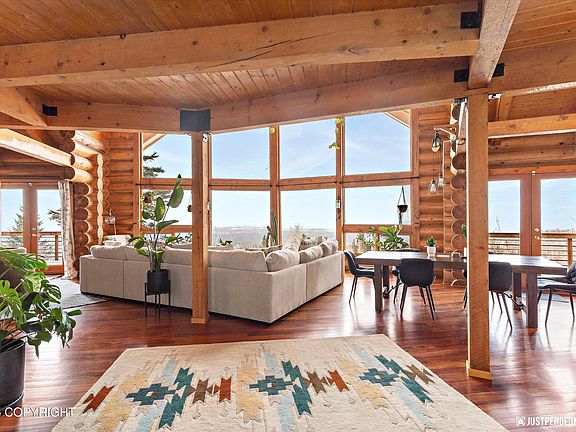 Captivating views of Denali, Foraker, Sleeping Lady, the Alaska Range, and the Cook Inlet from this custom log home. Entertainers dream complete with indoor and outdoor entertaining spaces. Wildflowers abound in summer around the house. Recently installed RV/Toy parking pad. This inviting craftsman home sits on just over an acre with cedar decks picture windows, rustic contemporary finishes.Perched on the hillside with 180° of This inviting, sunny craftsman log home sits on just over an acre with cedar decks picture windows, rustic contemporary finishes including exposed beams, cherry hardwood floors, tigerwood trim accent, tongue & groove ceilings, spacious granite kitchen complete with double ovens, walk-in chef's pantry, butcher block island, quartz counters, stainless steel appliances & heated slate entry. Enjoy Alaskan views from nearly every window. 3 large bedrooms, and multiple flexible spaces to include a separate office/den library/family room, main floor ensuite could be future in-law quarters with direct exterior access, loft flex room has 3/4 bath and could be future 4th bed or additional ensuite. Walkable access to one of the most extensive trail systems for skiing, biking and running in Anchorage. 80% of the home was rebuilt in 2011-2012 after a furnace fire - all the work was permitted and documented.