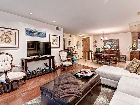 Located in the Villas del Rey complex in a lovely almost private, park-like setting, this unit has an open living room/dining room floorplan, dark hardwood floors, recessed lighting, fireplace, and sliding doors to the expansive patio; The patio faces out to the green belt between two Villas del Rey buildings, and is spacious enough for BBQ area, umbrella table and chairs, and chaise lounges; (Many of the plants and some of the patio furniture can be included for the buyer). The kitchen has rich wood cabinets, light cream tile counters, and stainless steel appliances; Both bathrooms have been completely remodeled in the last 7 years with tasteful tile, contemporary fixtures and color scheme; Forced air heat and AC were also replaced as well; The all-amenity complex offers ample guest parking, a pool and two spas, and two tennis courts; Well-run association, w ample reserves. Villas Del Rey is a non-smoking complex.