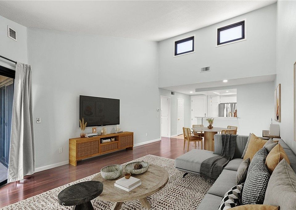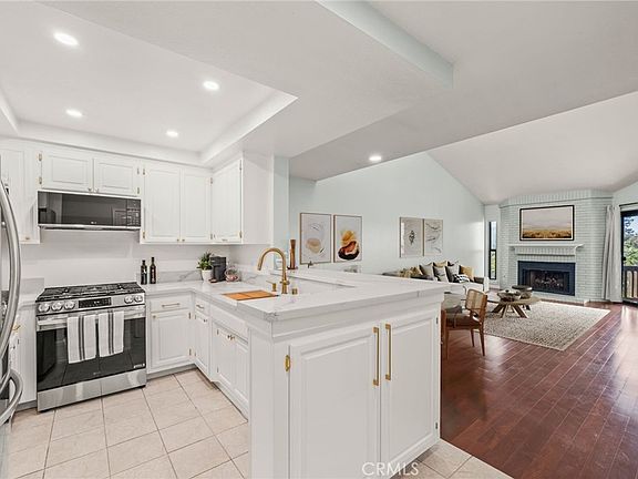 Step into this spacious, sun-drenched top-floor unit in the sought-after Villas Del Rey community—walking distance to the beach! Enjoy dramatic vaulted ceilings, a cozy fireplace, and a generous west-facing balcony with peaceful treetop views.