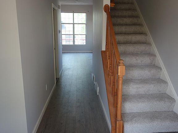 Lovely 3 bedroom 2 bath townhouse with attached garage. Freshly painted, new water resistant laminate flooring, and new carpet. The home has an open floor plan. The living room has a vaulted ceiling with ceiling fan. The dining room has a slider which leads to the deck. The kitchen has a breakfast bar and plenty of cabinet and counter space. The kitchen appliances are staying with the home. Laminate flooring is in the living room, dining room, kitchen and foyer. There is a first floor laundry room off the kitchen and the washer and dryer are included. The first floor bedroom is ideal for an office or den. The master bedroom is on the second floor and has a vaulted ceiling, ceiling fan, and two walk-in closets. The third bedroom is on the second floor and has a large closet. There is a full bath on each floor.