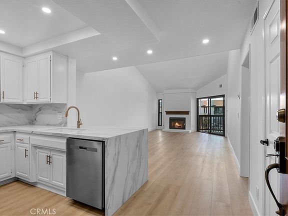 Welcome to 8601 Falmouth Ave #418, a highly sought after top floor unit in the beautiful Villas Del Rey. The spacious, light and bright living area has soaring ceilings and a gas fireplace. The living room leads out onto the west facing balcony through large sliding doors, and has sweeping views over the swimming pool and the tennis courts. The large bedroom has a walk in closet on one side and a walk through vanity area on the other side which leads to the bathroom. The bedroom also has sliding doors leading out onto the balcony. Down the hall is the in-unit laundry area with brand new washer and dryer, and a guest bathroom. The kitchen includes all new stainless steel appliances and features a waterfall countertop and breakfast bar. Some of the recent updates include recessed lighting with dimmer switches, new luxury Vinyl Plank flooring, quartz countertops and a fresh coat of paint. The tandem two car parking spots are right at the entrance to the foyer and the elevator. Also just steps from the elevator in the garage is the secured storage room with its own large enclosed storage space.