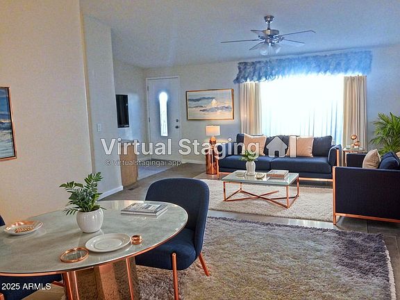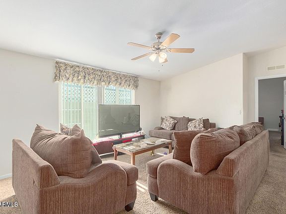 Welcome to this inviting 2006 home offering 3 bedrooms, 2 bathrooms, and a spacious 1,457 sq. ft. of living space in a desirable all‑ages community. Sun Gardens Estates features a low HOA of just $60/month, which includes trash service and access to common areas. Community Perks include a family‑friendly neighborhood with a large park, basketball court, and playground. Conveniently located near Loop 101, shopping, dining, and everyday amenities. Parking & storage include generous parking options with an RV gate for secure behind‑gate parking covered carport for 2 vehicles. Interior Highlights offer an open, split floor plan for privacy and flow & a spacious kitchen with abundant cabinetry and a walk‑ laundry with full-size washer and dryer. Security screens on both doors. No interior steps. Large primary suite with mirrored walk-in closet and ensuite featuring a garden tub, walk-in shower, and dual sinks. Guest bedrooms are roomy and have walk in closets.