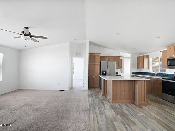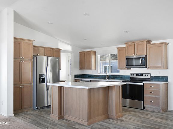 Stunning, like new 2023 home in an amazing location on the edge of Glendale/Peoria. This home comes well equipped with stainless steel kitchen appliances, premium linoleum flooring, a covered driveway, covered patio, en suite master bedroom/bathroom, and much more! Washer and dryer INCLUDED with home. With vaulted ceilings and large windows, this home has an abundance of natural light. Backyard with lots of potential! Wonderful all-age community with pool, kiddie pool, basketball court, and RV storage. Pet friendly. Priced for quick sale. Must be approved with park.