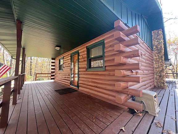 Nestled in the woods is a beautifully maintained 2 level log/cedar home on 4.2 ac m/l. Come in and unpack your bags to start living the country life. The kitchen is a cooks delight-equipped with frig, dishwasher, range & microwave. Oak cabinets feature pull-out shelves & pantry. The center island seats 4 and there is a sideboard for more counter and seating. Walls & ceilings are mostly log, pine T&G; flooring is wood, hickory & tile. Numerous windows allow for a bright and cheery home. The main level has a large dining room, bath and large bedroom. The lower level—with inside and outside access— can easily be a second living area. It features tile flooring .The family room has a working wood stove. The bathroom has an oversized custom walk-in shower. Both bedrooms can handle a king-sized bed with ease and both have large closets. There is a separate laundry with washer & dryer, storage closets and mud room. Like the upper level, pine T&G cover most of the walls and ceilings. Central HVAC. Other features: Metal roof, loft, 360 degree wrap around deck, thermopane windows and sliding glass doors. Ample parking for multiple vehicles. 5G internet (NEXT). City water.