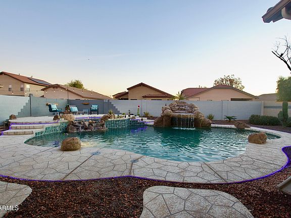 You'll LOVE this remarkable 5-bed, 3-bath home with a resort style POOL & SPA! Its charm starts with a 3-car garage, great curb appeal & a front porch. Fabulous interior features plantation shutters, tons of natural light, designer paint, archways, and tasteful flooring-tile & carpet. The formal living/dining room & separate family room provide ample space for any occasion. The impressive kitchen boasts SS appliances, recessed lighting, ample wood cabinetry, extra eating area, & a peninsula w/breakfast bar. One bedroom & one full bathroom complete the downstairs. Head upstairs to find the main bedroom, offering an ensuite with dual granite sinks, separate tub/shower, & a walk-in closet. Enjoy your own backyard oasis, featuring several inviting seating areas, a serene waterfall, and pool.