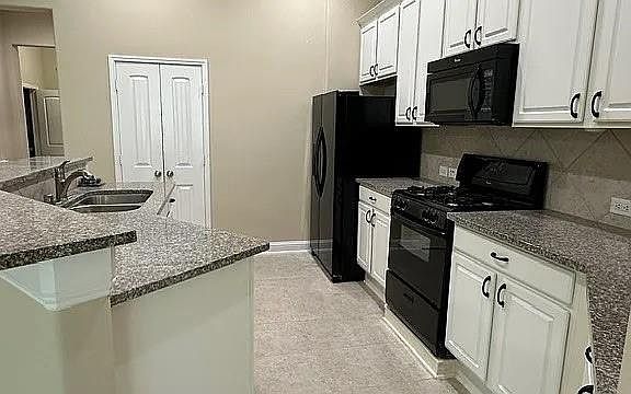 Traditional brick homeBlack appliancesGranite in kitchenWhite cabinetry