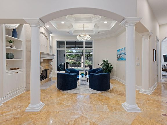 Experience the ultimate in resort-style living with this timeless two-story residence in the exclusive Majorca village of Fiddler's Creek. Showcasing private golf course views and an immediate full golf membership to the prestigious Members Club at Marco—bypassing the waitlist entirely—this exceptional home offers an unparalleled opportunity for luxury living in one of Naples' most sought-after communities. Thoughtfully designed, the spacious four-bedroom plus den, 4.5-bath floor plan combines elegant craftsmanship with modern comfort. Refined architectural details include travertine flooring, arched walkways, custom ceiling designs, and designer chandeliers that create a warm yet sophisticated ambiance. The tastefully updated chef-inspired kitchen impresses with sleek quartz countertops, stainless-steel appliances, and an open layout that flows seamlessly into the living room. Expansive glass sliders lead to an oversized screened lanai, where indoor-outdoor living takes center stage. The outdoor retreat is designed for both relaxation and entertaining, featuring a full outdoor kitchen with wine refrigerator, a heated pool with waterfall spa, and a covered lounge area complete with tongue-and-groove ceiling, cozy fireplace, and mounted TV. Inside, the first-floor owner's suite offers a peaceful sanctuary with a private sitting area, dual walk-in closets, and a luxurious spa bath featuring a jetted soaking tub and a walk-through shower. A beautiful wood staircase leads to the second level, where a spacious game room with built-in entertainment center provides the perfect gathering space. Two upstairs guest suites, each with en-suite baths and walk-in closets, ensure comfort and privacy. A separate cabana suite adds flexibility with its own bedroom and bath—ideal for guests seeking extra privacy. Additional highlights include a custom wine cellar, private elevator, new roof and gutters (2022), three new HVAC systems (2023), a tankless water heater, and a three-car garage equipped for an EV charging station. This exceptional property includes an immediate golf membership granting access to two championship courses—The Rookery and Hammock Bay—along with elegant clubhouses and private beach privileges at the JW Marriott. As a resident of Fiddler's Creek, you'll also enjoy world-class amenities such as resort-style pools, fine and casual dining, a luxurious spa, state-of-the-art fitness center, tennis and pickleball programs, bocce, sauna, steam room, and an active social calendar. A rare opportunity to own a residence where every detail embodies the essence of Naples' resort lifestyle.