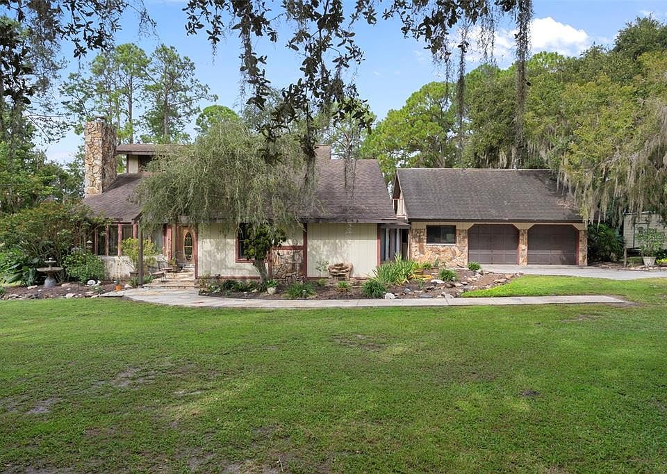 LOCATION, LOCATION, LOCATION! This property is offering both privacy and city convenience! This exceptional property has it all, it is charming and very unique but is in need of some TLC. No HOA, No Deed Restrictions, No CDD. This 3-bedroom 2-bath home sits on 2.2 acres of beautiful grounds with amazing wildlife. Welcome to country charm at its best! Features include large barn, large chicken coop, covered animal stall, enclosed tack room and a covered gardening/potting shed area. Plenty of space for all your toys and animals. Extra-large garage and workshop and an additional large storage building. The outdoor area is a true oasis. Inside there is an airy spacious feel to the home. Walking through the front door opens up to a lovely Livingroom with a beautiful stone wood burning fireplace, a dining room with French doors that opens out onto a large glass enclosed patio. There are two bedrooms and guest bathroom downstairs and laundry closet. Kitchen features a large walk-in pantry and a dining area with French doors that walk out onto the large glass enclosed patio. The upstairs area is truly amazing!! Walk up the stairs to find a quaint sitting loft area which opens onto a balcony, sit and enjoy your morning coffee while enjoying the beautiful scenery of your backyard and a view of the Lake in the distance, or enjoy a cocktail in the evening while you watch the beautiful sunsets. The primary bedroom offers a private office space/bonus room and an addition large side bedroom with a sliding glass door that opens onto a private deck area that takes you over to an additional private bedroom / bonus room (perfect man cave), there is also a staircase that takes you downstairs to the breezeway area between the home and garage. There you can enter into the dining room and kitchen, enter through the door into the enclosed patio or enter into the garage & workshop. This property is ideal for those seeking extra room both inside and out. This home is conveniently located just minutes from all the amenities of Wesley Chapel. Exceptional hospitals, tons of shopping, you have The Grove and KRATES at the Grove, B&B16 Theaters, The Shops at Wiregrass and the Tampa Premium Outlet Mall. Located less than 3 miles to the popular Epperson Lagoon the first crystalline lagoon in the U.S it is a 7.5-acre resort-style community, where you can purchase an All-Day Ticket & Splash Pass to enjoy the water park w/ water activities, including kayaking and obstacle course. Conveniently located to I-75 and I-275 to access Tampa, Clearwater/ St. Petersburg and Orlando. Schedule your private showing today.