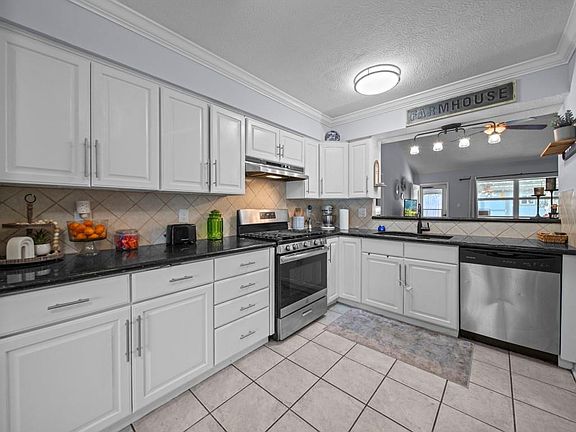 High ceiling family roomGas cookingStainless appliancesHandy storage buildingGranite countertopsCovered patioTile backsplash and floor