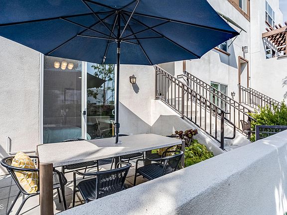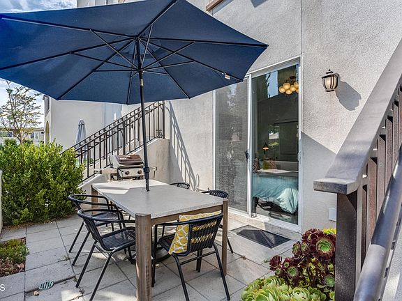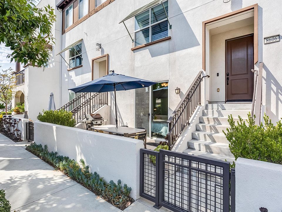 A luxurious modern gated community comprised of 46 townhomes designed by famed architect Irving Gill! Save on utility bills with full Solar Panels already paid off and EV Charging for a Tesla in the oversized 2 car garage w/ built-in shelving/bike racks. Two master bedrooms, one on the 1st floor w/ en-suite full bath and a large deck w/cement pavers and planters perfect for entertaining and dining al-fresco! Gleaming Hardwood flooring and Crown molding throughout leads you to the 2nd floor showcasing a Great Room w/ upgraded wood shutters and built-in Surround Sound Media Package! Enjoy epic Movie Nights in your Theater Room, with room for a projector screen! Host dinner parties in your large dining room, that opens up to your oversized kitchen featuring quartz counters/island, custom individually laid backsplash tiles, high-end stainless-steel appliances and a balcony! Head upstairs to your home office which is flooded with natural light and vaulted ceilings! 3rd floor includes the second master bedroom with large Master bathroom and ample natural light, 2 guest rooms w/ an additional full bathroom and laundry/storage area. Entertain friends and family at the beautiful sparkling community pool and barbeque area surrounded by lush landscaping and a lawn area perfect for your pets! Close proximity grocery stores, restaurants, shopping and more! Conveniently located close to Metro Rail Line, Airports, Amusement Parks, Discovery Sports Park & Event Center, minutes from freeways to connect you to Los Angeles and Orange County. This home is ideal for those looking for that comfortable work/live lifestyle! Perfect place to call home!