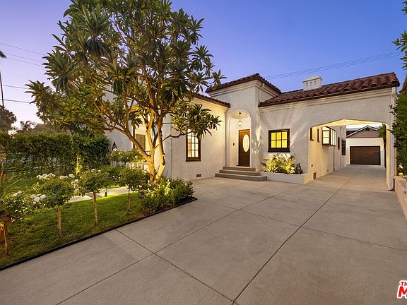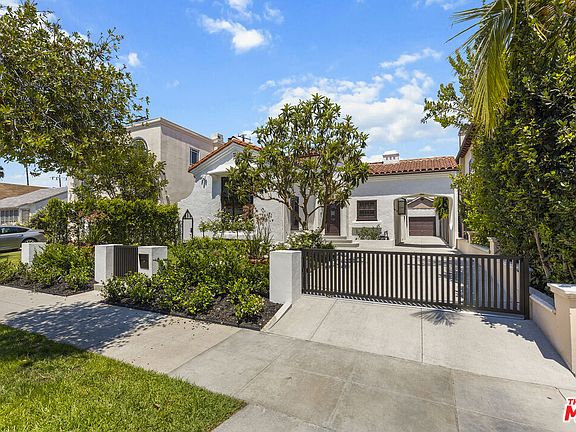 Presenting a beautiful, freshly updated 1930s Spanish at the edge of Beverly Grove in a prime location and one of the best pockets of the city. Set behind a secure, gated entry with manicured landscaping, a grassy lawn, and blossoming florals, the home's charming facade welcomes guests inside. Discover a bright and elegant formal living room with large picture window, stylish original details throughout, traditional mouldings, stucco wood-burning fireplace, wide-plank oak floors, and farmhouse-style casement windows. Chandeliers and light fixtures are elegant. Adjacent to the formal dining room is the gourmet kitchen, complete with garden window, large stone-topped center island, custom cabinetry, backsplash, and top-tier appliances. Stackable laundry with wash sink is nearby. Bedrooms are spacious, and bathrooms are appointed with on-trend cabinetry and hardware, with a smart mirror and dual-sink vanity in the main bath. There is also a bonus room/home office, ideal for remote work or creative use! The rear patio/outdoor living area is the perfect place to relax, entertain, barbecue, and dine al-fresco below enchanting string lights on warm summer evenings. The gated front yard has a long, private driveway, garage, and porte-cochere offering ample parking for multiple cars. Welcome to this highly sought Beverly Hills location central to museums, parks, fine dining, and nightlife, just moments to top Beverly Hills amenities, the Westfield Century City mall, the Beverly Center, Cedars-Sinai, Trader Joe's, Rodeo Drive, The Grove and Original Farmers Market, and all the very best of the Westside. Some photos are virtually staged.