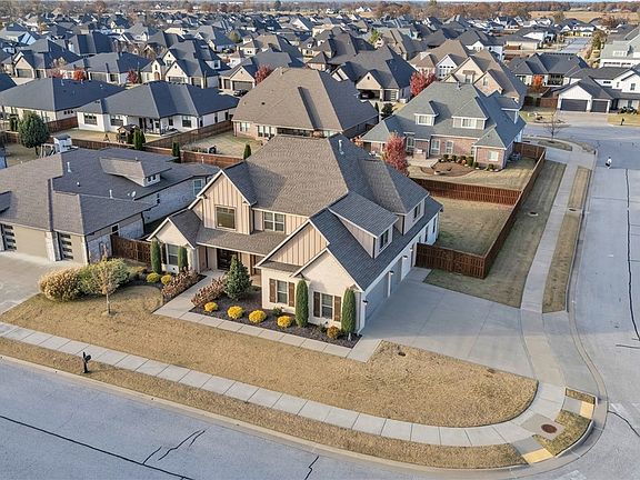 Located in the prestigious gated Scissortail Subdivision, this exceptional corner-lot home blends timeless elegance with modern comfort. Enjoy exclusive community amenities including a clubhouse, pool, fire pit, and playground - all within walking distance. Inside, natural wood floors, beamed ceilings, & bright open living spaces showcase this home. The desirable layout offers two bedrooms on the main level, including a luxurious owner’s suite with a soaking tub, tiled shower and spacious closet. The gourmet kitchen features a large 9' island, gas cooktop with pot filler, abundant cabinetry and an extended dining area that includes a wine fridge. The great room with a beautiful stone fireplace & decorative mantle is accented by a wall of windows that look out onto a covered patio with a wood-burning fireplace and built-in grill. Upstairs offers 2 additional bedrooms, a large bonus room with wet bar and ample storage. Experience refined living and exceptional community amenities in sought-after Scissortail.