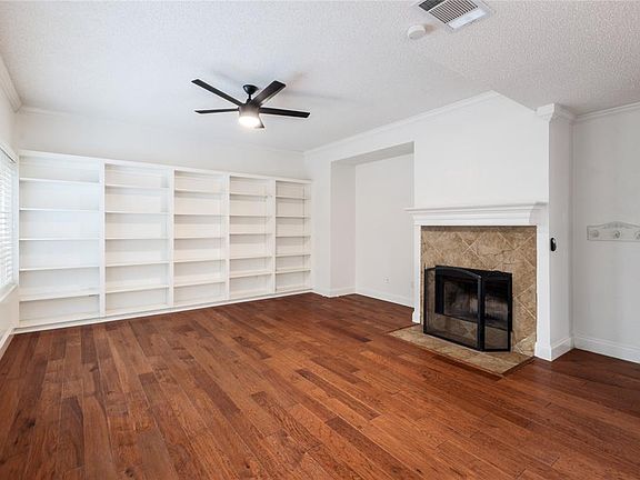 Cozy fireplaceBrick frontOpen floor planFormal room