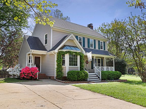 Welcome home to 8608 Cheerful Ct. in Raleigh, NC boasting 3 bedrooms and updated 2.5 bathrooms. This gorgeous home, nestled on a quarter-acre lot, exudes charm and character inside and out, from its inviting architectural details to the cozy interior spaces. Mature trees provide wonderful summer shade, and established flowering plants add seasonal beauty. The deep front yard offers privacy from the street and feels like your own private park, while the covered porch with a swing is perfect for relaxing. The warm, welcoming floor plan includes a spacious living room with a cozy, wood-burning fireplace, a formal dining room, and a galley-style kitchen. Upstairs, the primary bedroom feels like a treehouse retreat, complete with a walk-in closet and private en suite, while a third-floor bonus room provides an ideal work-from-home space. Excellent storage abounds, with space off the secondary bedroom, a walk-up attic, an outdoor storage closet and shed, and a wide pantry. The double-wide, deep driveway offers ample parking for daily use and entertaining. The neighborhood boasts fantastic amenities including a pool with swim team, tennis courts, a park, and seasonal HOA activities—all with low HOA dues. Enjoy easy access to highways and shopping without battling traffic to reach 540. Significant updates in 2016, 2019, 2020, 2022, and 2024 ensure peace of mind. The fenced backyard with patio and blooming trees completes this home's perfect blend of comfort, functionality, and outdoor charm. The possibilities are endless!