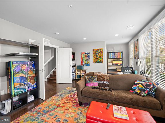 Welcome to the Crawford II Model, an end unit gem. Experience over 2,800 square feet of beautifully crafted living space in this sought-after Crawford II townhouse — one of only three of its kind. Spanning four levels and featuring a two-car garage with extra storage, this exceptional home is loaded with premium upgrades and modern design touches throughout. Step onto the front porch and into a welcoming foyer that opens to a versatile entry-level space — ideal as a guest suite, home office, or fourth bedroom — complete with a full bathroom. This level also offers a coat closet and generous storage, along with direct access to the attached two-car garage. Flooded with natural light from 14 windows, the main level features soaring ceilings, rich hardwood floors, and an open layout perfect for entertaining. The gourmet kitchen is the heart of the home, showcasing a five-burner gas stove, expansive island with seating for six, and direct access to a balcony with a barbecue grill— perfect for indoor/outdoor dining. A stylish “cloffice” (closet office) and a convenient half bath complete this floor. Upstairs, you'll find three spacious bedrooms and two full bathrooms. The primary suite features an en suite bath with dual vanities, tiled shower, and a professionally designed walk-in closet. Two additional bedrooms include built-in professional closet systems, and a full-size washer and dryer are also conveniently located on this level. The fourth level offers a private tree lined rooftop escape — perfect for morning coffee, evening cocktails, or gatherings under the stars. A large awning with remote control provides year-round comfort, and additional storage with a beverage fridge makes entertaining easy. Situated just minutes from Downtown Silver Spring, this home offers unbeatable access to shopping, dining at numerous restaurants including Zinnia, the Metro, Whole Foods, and more. Enjoy modern luxury and urban convenience all in one incredible home