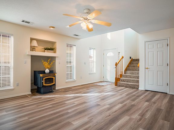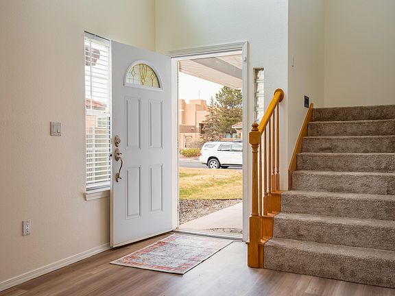 Fall in love with this far Northeast Heights one owner home, boasting pride of ownership, meticulously maintained inside & out! Located in sought after neighborhood Vineyard Ridge, a couple of minutes to top rated Desert Ridge Middle School & La Cueva High School! Discover NEW carpet, freshly painted, NEW vinyl 'wood like' floor in living room, dining & kitchen, Jan, 2024! Remodeled kitchen with new cabinetry, granite counter tops & tile backsplash! An awesome & generous sized family room enhanced w/soaring cathedral ceiling, clerestory windows, fireplace & atrium door to patio! Master suite offers a view balcony & updated bathroom with new vanity, decorative mirrors & walk-in closet! Each secondary bedroom has their private vanity! Oversized 3 car garage with workshop! BACKYARD ACCESS!