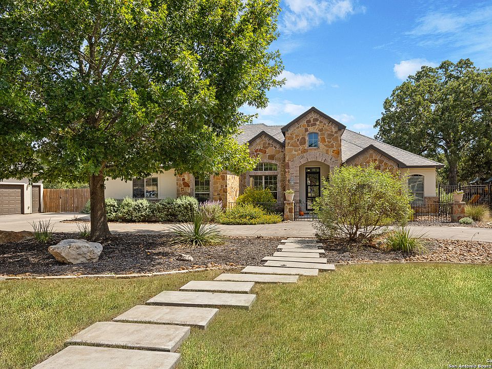 Experience luxury living in this exquisitely remodeled 4,292 sq ft home on a private 1-acre lot in highly desired back of Deer Meadow Estates in Fair Oaks. The expansive open-concept main level is perfect for entertaining, featuring a gourmet kitchen with a statement waterfall quartz island, high-end appliances, and a stylish living room with a slatted-wood feature wall and fireplace. This highly functional floor plan offers true flexibility. The main level includes the primary suite, three additional bedrooms, three full bathrooms, a dedicated office with custom built-ins, and a formal living or dining room. Upstairs, discover a spacious game room, the fifth bedroom, and the fourth full bathroom, creating an ideal guest or teen suite. Luxury touches abound, from the modern light fixtures and custom wine/coffee bar to the wide-plank flooring and quartz countertops throughout. Large sliding glass doors open to an expansive covered patio overlooking the tree-studded backyard, blending indoor and outdoor living. This exceptional property offers the perfect combination of high-end design, everyday comfort, and serene Hill Country acreage. Located in Exemplary Boerne ISD!