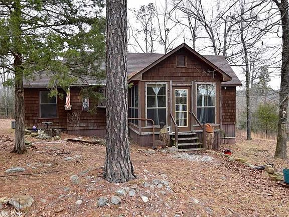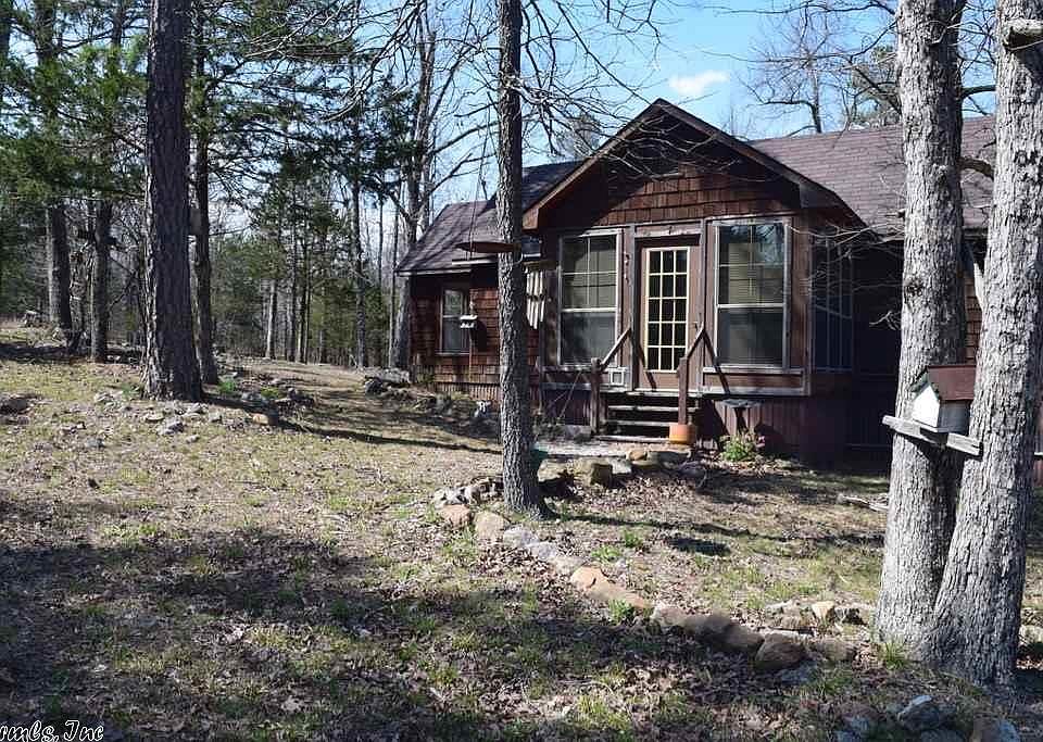 Unique cabin tucked away on 9 wooded acres offers privacy and seclusion. One bedroom, 1 bath 960 square foot cabin with 8' ceilings and 2 bonus rooms that could serve as small bedrooms, craft or office space. Sunporch entrance, large eat-in kitchen, laundry room and floored attic with lots of storage space. Studio directly behind cabin could also serve as a guest house. Outside storage area with parking. RV parking, circular drive and large 2-bay automotive shop. Next to last residence on non-through road.
