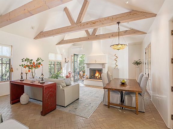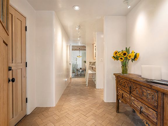 Nestled on a hillside on the sought after Eastside of Santa Fe, this classic Northern New Mexico pitched roof home and guest house blends timeless design with natural surroundings. The welcoming entry revealing vaulted beamed ceilings, beautiful plaster walls, brick floors, a raised fireplace, and light-filled living spaces. The well-appointed kitchen, featuring honed marble counters, top-tier stainless steel appliances, and ample counter space, adjoins the great room and a cozy den/library, creating the perfect balance of elegance and comfort. French doors open to a terraced landscaped patio with a wisteria draped pergola, offering a private sanctuary for outdoor living. Upstairs, the romantic primary suite offers a serene retreat with a spa-inspired bath finished in tumbled marble and travertine, along with captivating mountain views. Adding to the appeal, a private detached guest house—complete with its own kitchen and bath—sits above the oversized two-car garage, ideal for guests, extended family, or creative pursuits. A rare opportunity to own a secluded hillside retreat that combines Northern New Mexico charm with modern amenities, all just minutes from the historic Santa Fe Plaza and surrounded by nature.