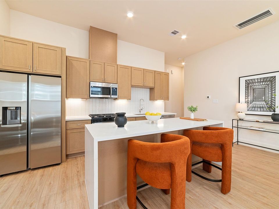 Engineered wood flooringStainless steel appliancesWaterfall islandExpansive walk-in closetQuartz countertopsSoaking tubTall ceilings