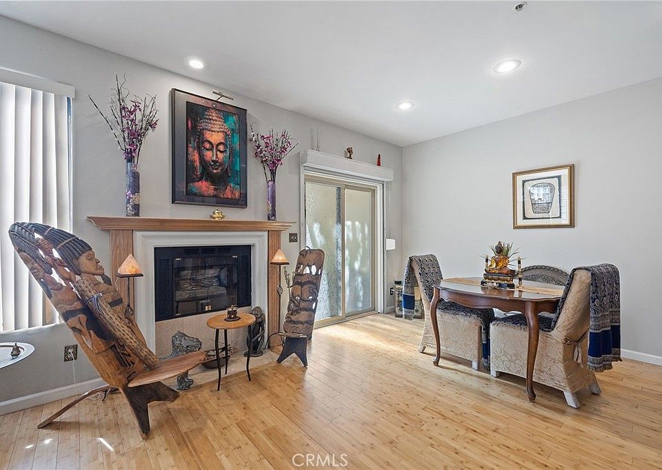 Step inside and be greeted by a bright, airy floor plan featuring a spacious living area with a cozy modern fireplace, a versatile dining or office space, and a well-appointed kitchen with rich wood cabinetry, granite countertops, and a decorative backsplash. Throughout the home, enjoy bamboo hardwood floors, recessed lighting, and custom double roller shades that elevate every detail. Both bedrooms offer en-suite bathrooms for privacy and comfort, along with an in-unit laundry closet for convenience. The unit sits above a secured subterranean garage with dedicated tandem parking.