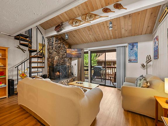 Don't miss your chance to own at the base of Snow Summit! This turnkey townhouse offers the perfect combination of location, comfort, and convenience. Just steps from the ski slopes, mountain bike trails, and a short drive to Big Bear Lake and the Village, it's an ideal retreat for year-round adventure. The spacious layout includes 2 bedrooms, 1.5 baths, plus a versatile loft for storage or additional sleeping space. The living room features vaulted ceilings and a wood-burning fireplace, creating the perfect apres-ski gathering spot. Enjoy two private patios--an upper deck off the living room for outdoor dining with mountain views, and a lower patio off the primary bedroom for quiet relaxation. The updated kitchen features granite countertops, a breakfast bar, and is open to additional dining area. Durable and attractive laminate flooring throughout. The HOA covers water, trash, Wi-Fi, snow removal, and exterior upkeep, so you'll enjoy all the benefits of mountain living without the hassle of maintenance. Community amenities include a seasonal in-ground heated pool, recreation room, and BBQ area. A huge bonus is the 2 parking passes that allow direct access to the condo lot right at Snow Summit--unmatched convenience for skiing, boarding, hiking, or biking. Whether you're seeking a weekend escape, vacation rental, or a place to call home, this Snow Summit gem checks all the boxes. Start making lasting mountain memories today.