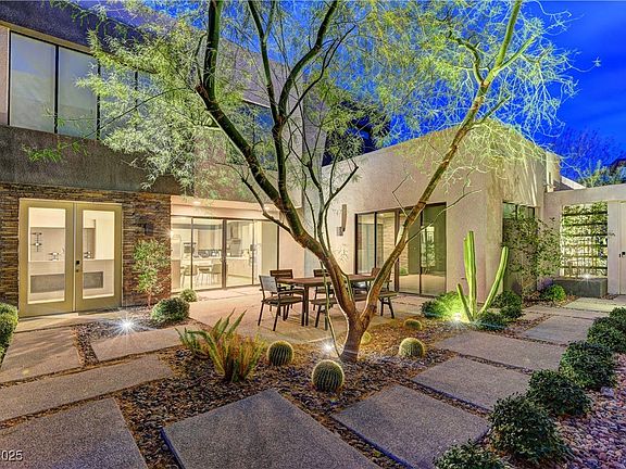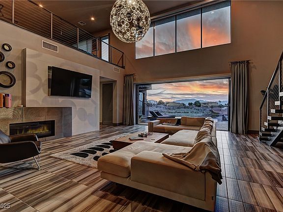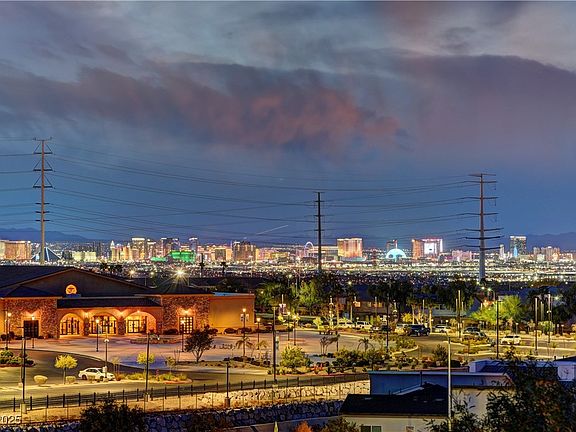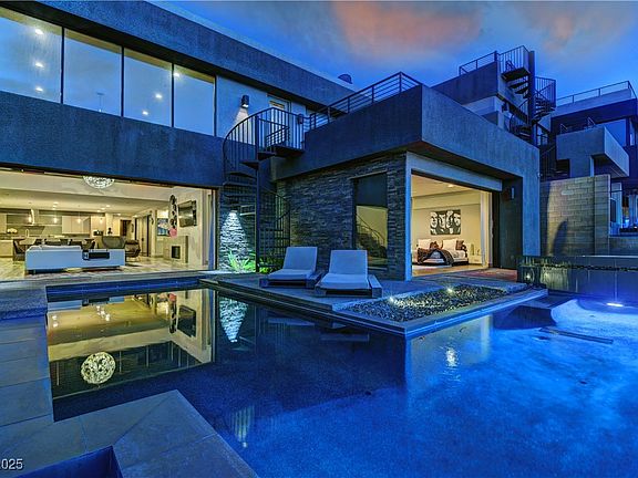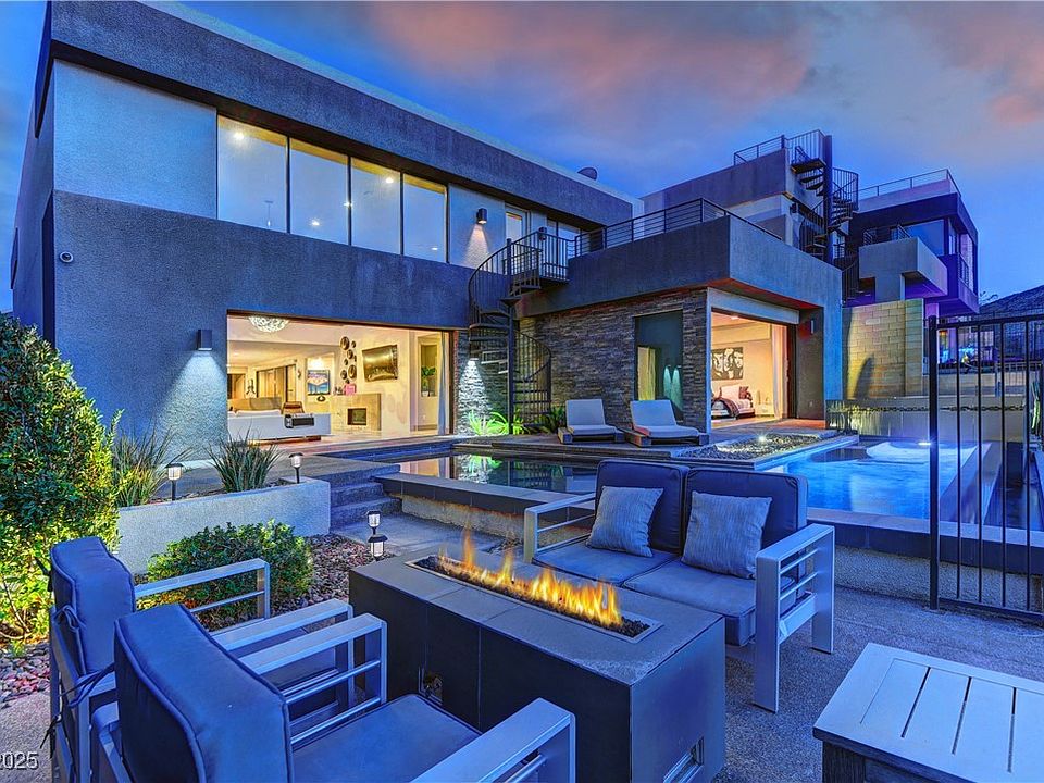 Experience elevated living in this contemporary Blue Heron showpiece in the exclusive gated Sky Terrace enclave. Spectacular Strip views and fluid indoor-outdoor integration. A floating staircase ascends to a loft with built-in wet bar, while the chef’s kitchen features an L-shaped island, central prep station, sleek cabinetry, and high-end Kitchenaid appliances, including a built-in espresso maker. The main floor primary suite opens to the infinity-edge pool and zero gravity spa, with a luxurious bath w/dual vanities, oversized shower, & custom walk-in closet. Outdoor amenities include a built-in BBQ, fire pit, pool table, and stunning infinity-edge pool with zero gravity spa. Security is unmatched with 24/7 monitored cameras, shatterproof window film, and motorized shades throughout. This one-of-a-kind Las Vegas sanctuary blends modern design, comfort, and privacy in one exceptional package. Ideal location with quick access to Harry Reed international Airport and the Las Vegas Strip.