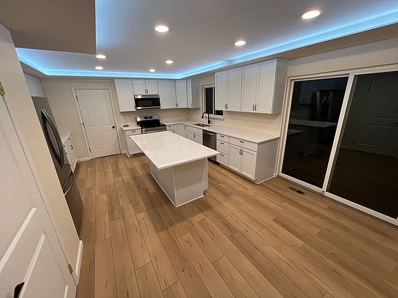 Gourmet Kitchen: The newly renovated kitchen features elegant white cabinetry, quartz countertops, a spacious center island, and brand-new stainless steel appliances.
